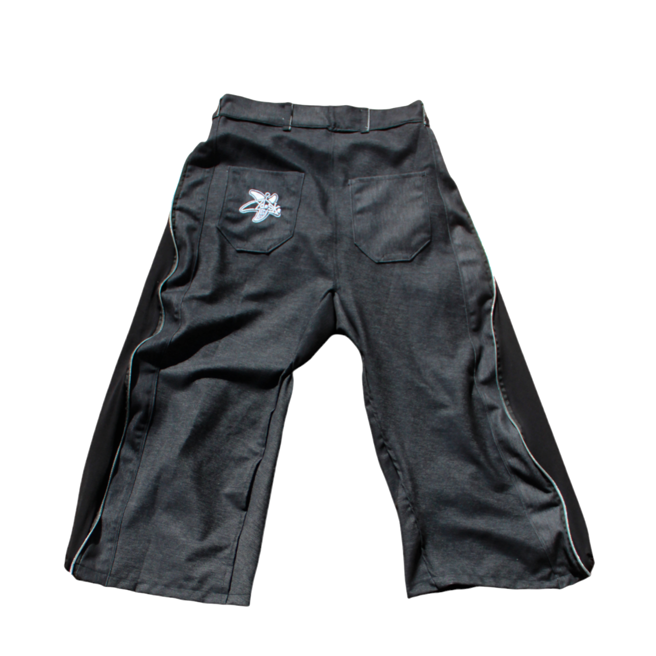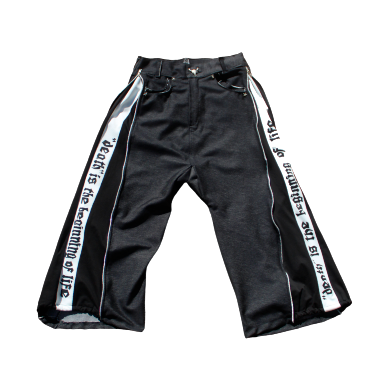 Black jeans with zippers on the sides, opening a black cotton tracksuit bottom, which widens the pants, with a white line, on it is written the slogan of the collection DIE TO LIVE ("death" is the beginning of life) in gothic letters, the garment has finishes and details such as star-shaped rivets on the front pockets, an embroidery with the Ydoska Clothing logo on the left back pocket, an elastic band at the bottom of the tracksuit and a button in the shape of a goat skull.