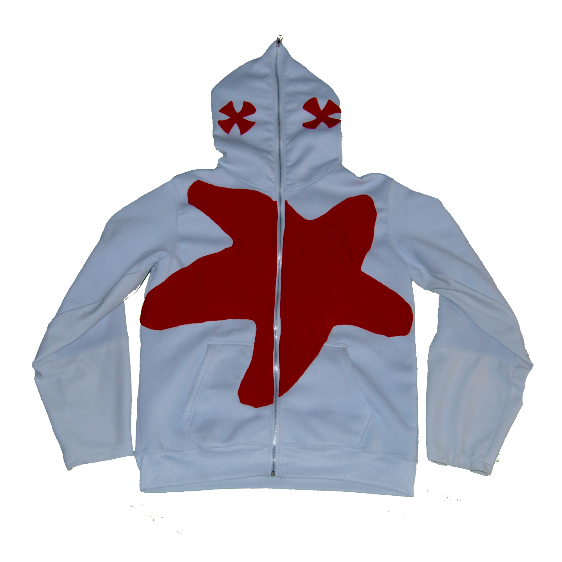 Sudadera de cremallera completa de poliester en color blanco, con dos parches cosidos rojos en forma de cruz en la capucha y uno grande con la "Y2K Star", en rojo en medio de la cremallera.