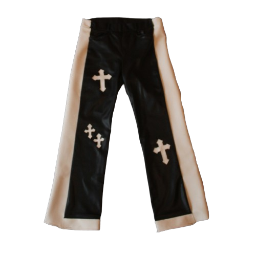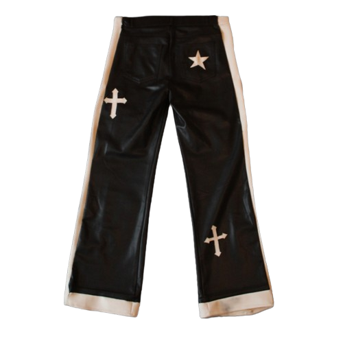 Pantalón de cuero negro con franjas de cuero blanco a los laterales y en la parte inferior con decoraciones de cruces y estrellas en cuero blanco.