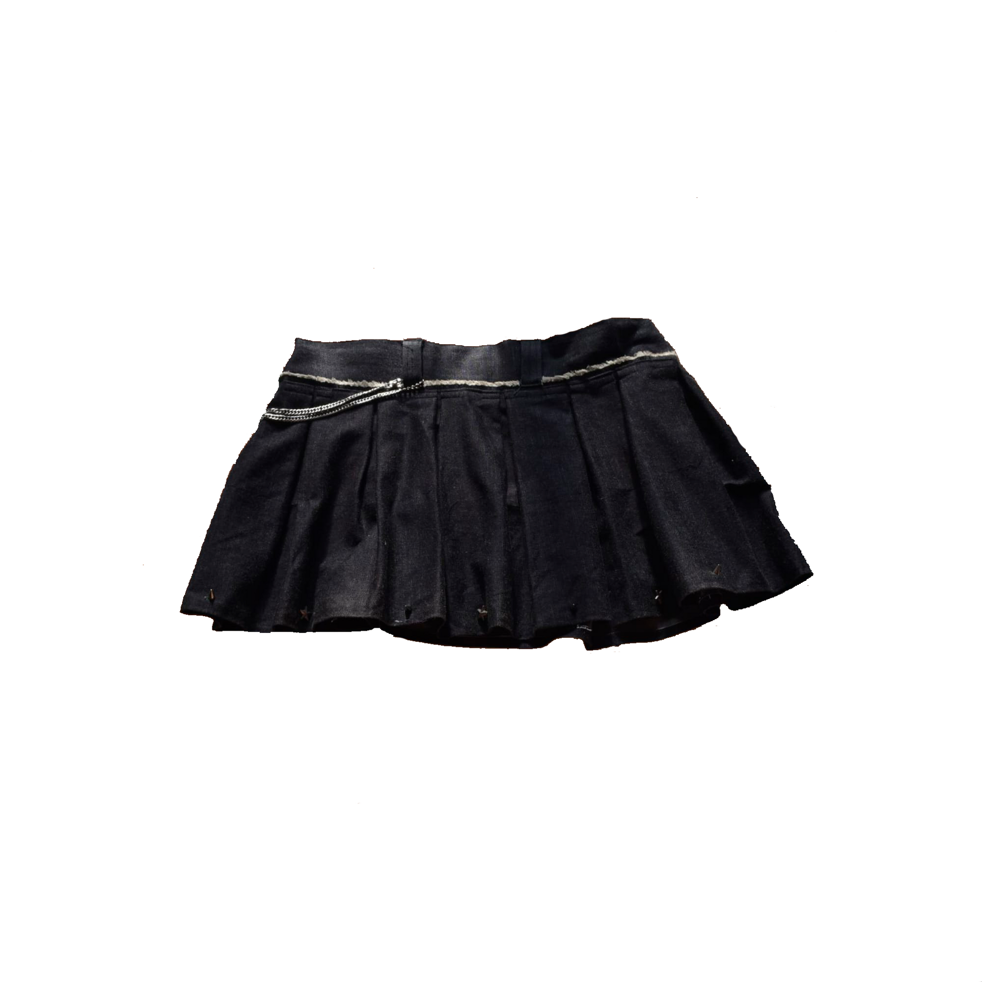 Falda corta de tejano negro con pliegues, cadena decorativa lateral y aplicaciones de tachas metálicas en forma de estrella en la parte inferior. Diseño juvenil y estilo urbano.
