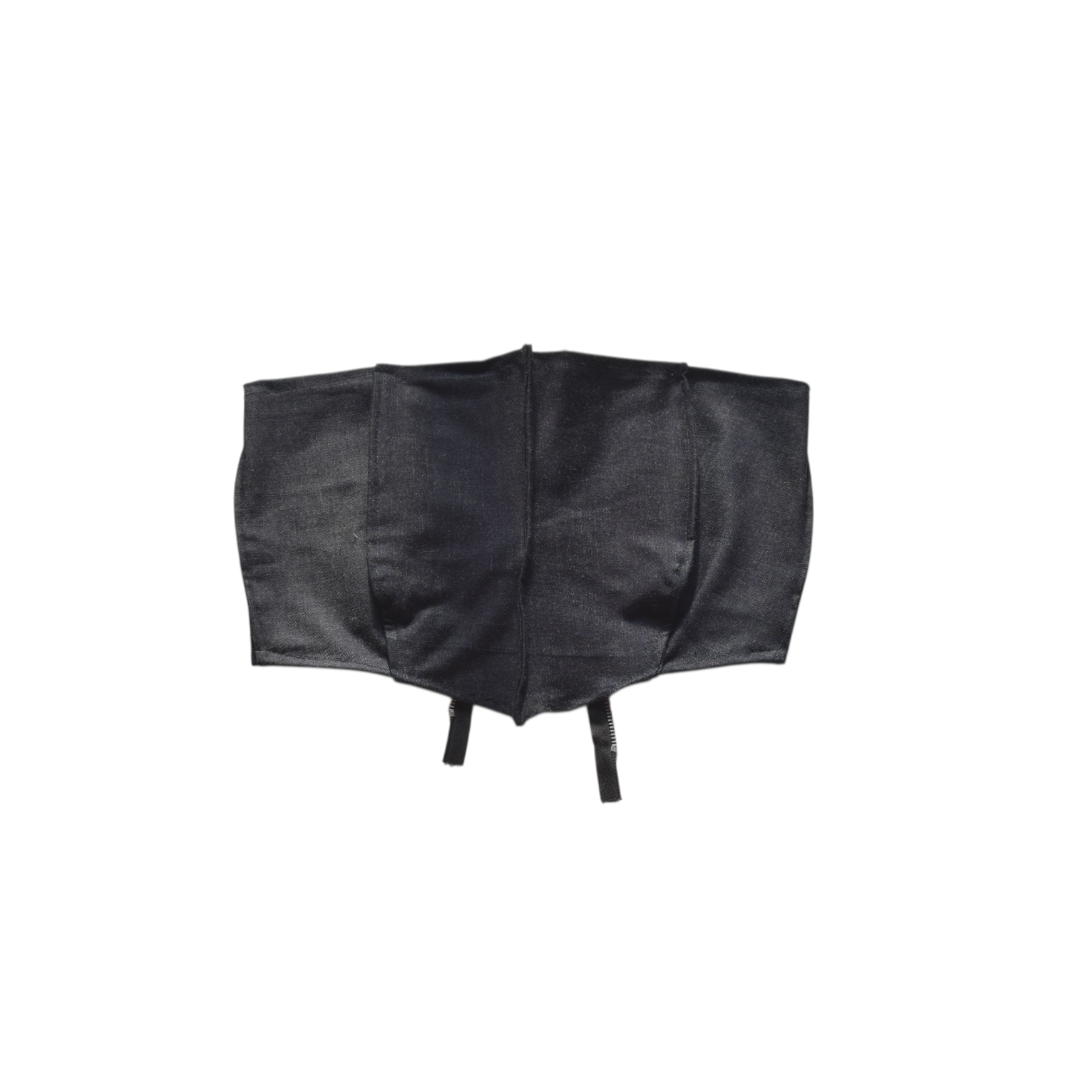 Corset top de tejano negro con estructura entallada y diseño de costuras marcadas. Presenta cremallera metálica en la parte posterior que se extiende hacia arriba y cae abierta sobre la espalda, aportando un toque moderno e innovador.