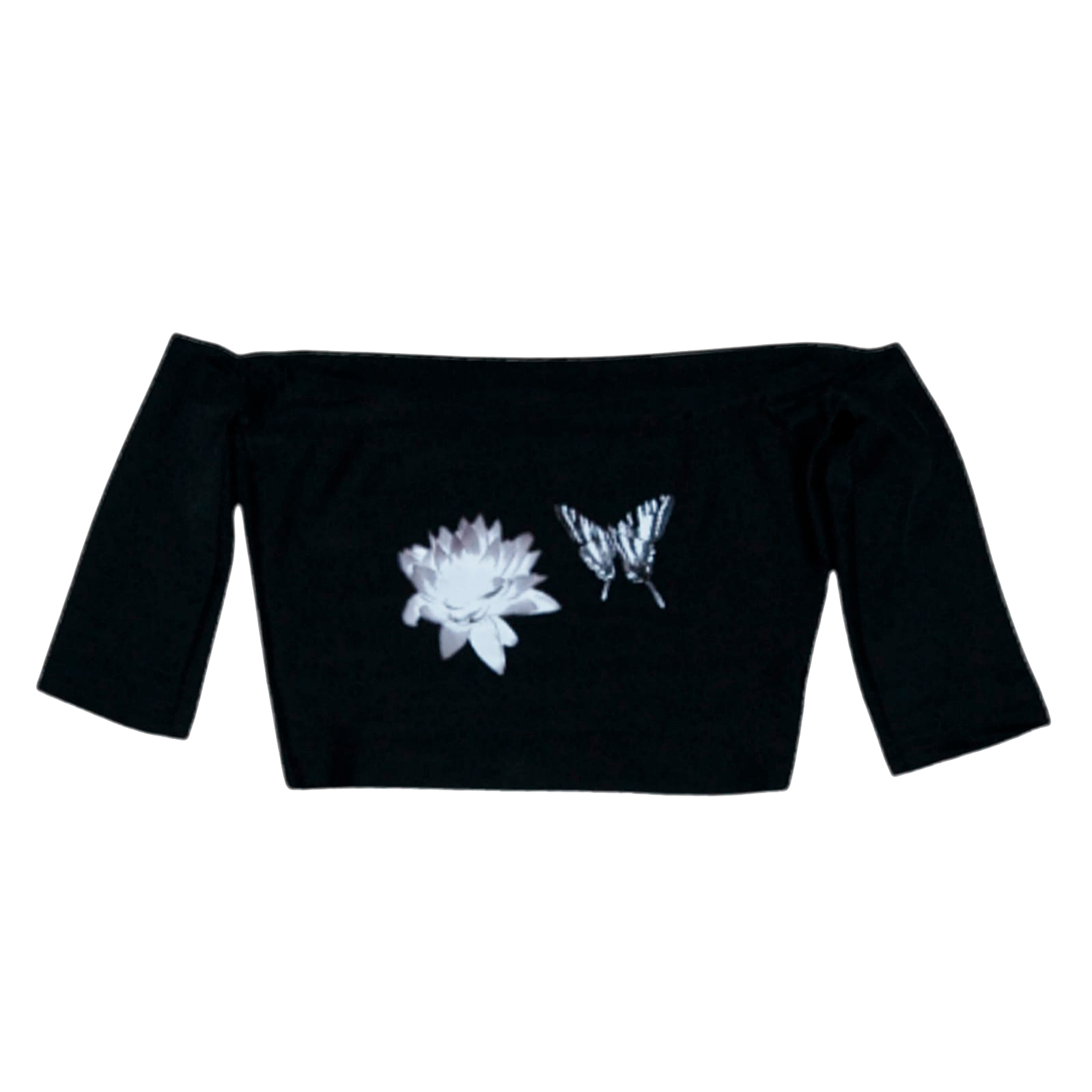 Top de algodón elástico con hombros descubiertos, ajustable y estampado con mariposa y flor.